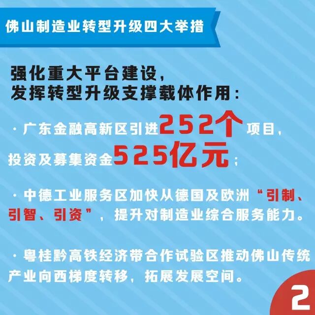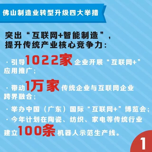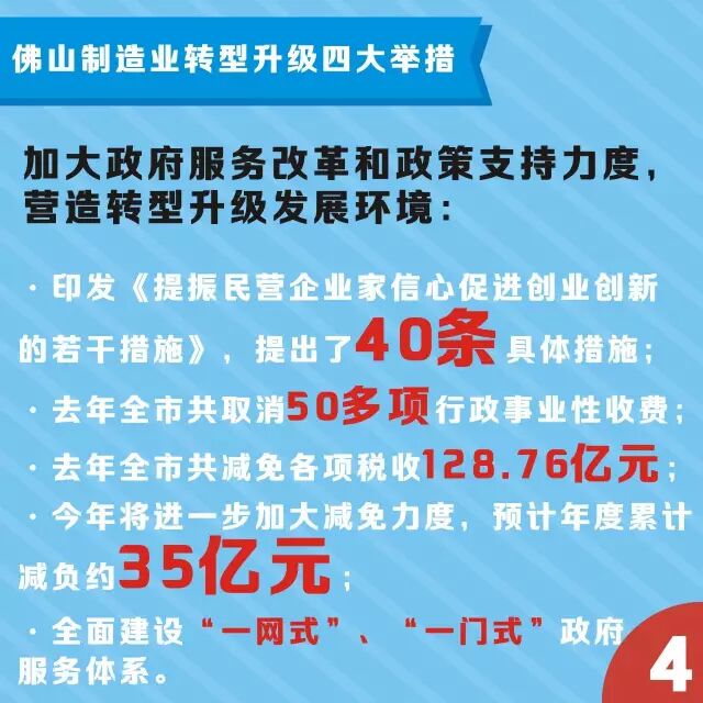 佛山制造业转型升级的经验主要有四条,就是突出“互联网 智能制造”,提升传统产业核心竞争力; 强化重大平台建设,发挥转型升级支撑载体作用; 实施创新驱动发展战略,积聚转型升级新动能; 加大政府服务改革和政策支持力度,营造转型升级发展环境。